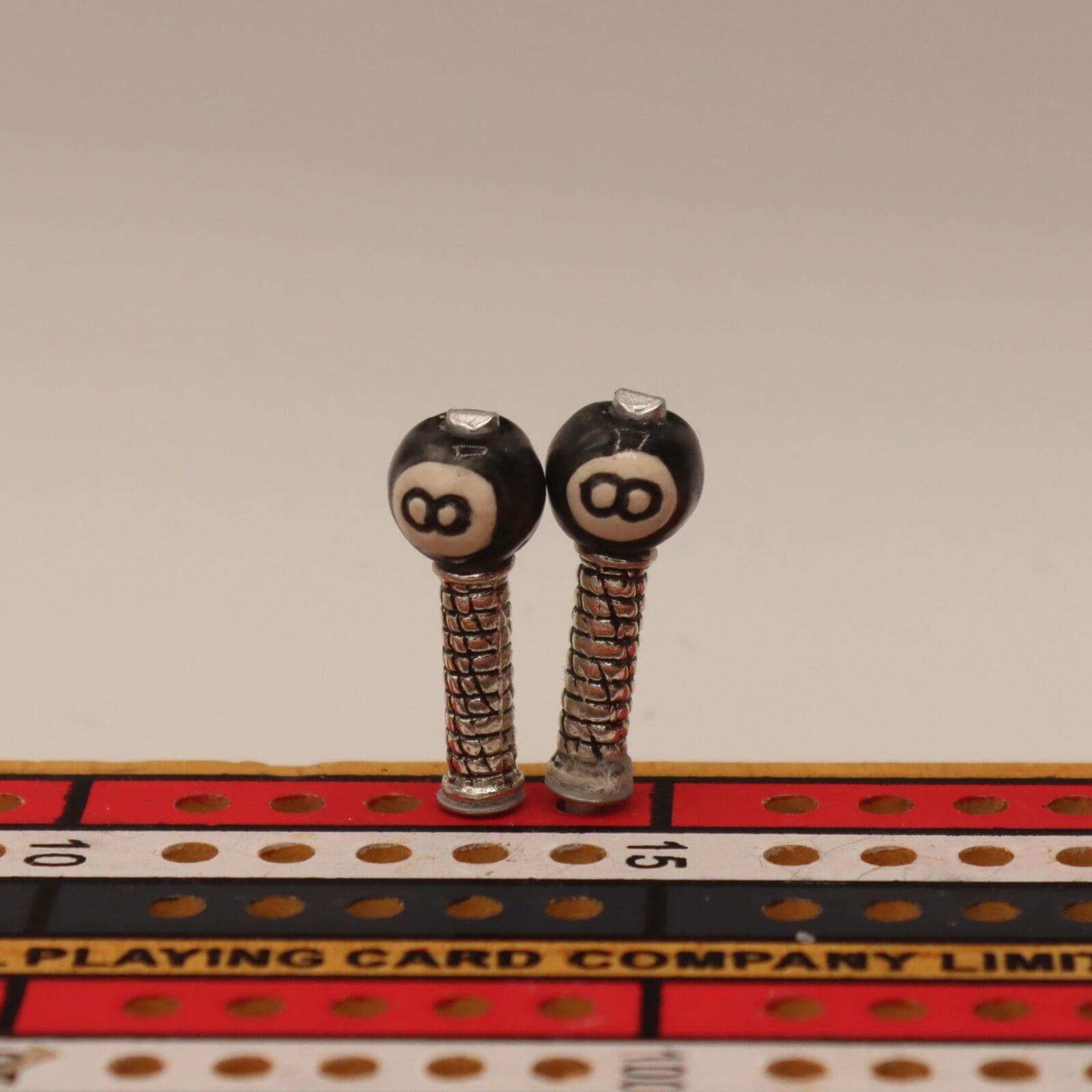 Bring a pool hall vibe to your cribbage board with Eight Ball Cribbage Pegs. These novelty scoring pegs feature detailed miniature eight ball toppers, perfect for collectors, billiards fans, or anyone who enjoys a sporty, playful touch to their game night. Made from high-quality, hand-painted Peruvian porcelain and set on a lead- and nickel-free metal alloy base with an aluminum peg, they bring a vibrant touch of color to any standard cribbage board.